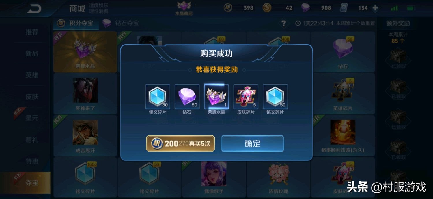 60荣耀积分:不知道为什么,小编的王者荣耀账号有4个,每一个都能通过官方赠送的荣耀积分和积分夺宝抵用券,在5次以内获得死神来了皮肤,如果这样理解,安卓玩家就亏大了,但其实仔细一想,官方从1月到现在已经送了7张积分夺宝抵用券了,所以感觉也不会太亏了。如果用来抽新品,大概可以获得5个碎片,也不是太值钱,所以荣耀积分作为本次补偿的最高奖励,好像由于只有60个,也没起到太大作用。