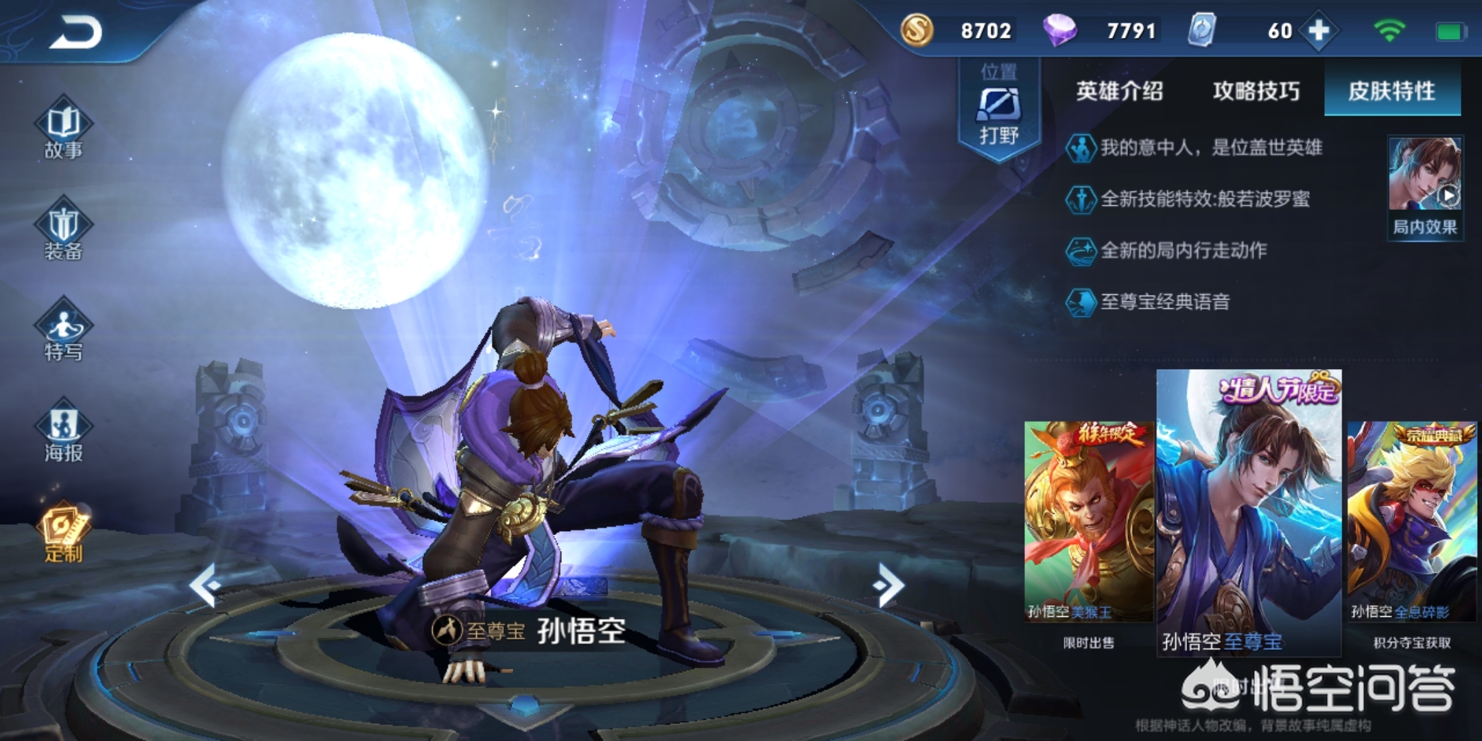 首先来说至尊宝这款皮肤情人节限定,全新的技能特效:般若波罗蜜以及全新的局内行走动作和至尊宝的专属语音,打击手感一级棒,与露娜的紫霞仙子皮肤为情侣皮肤,售价888点券。如果换作是无尘三选一我会首选至尊宝,至尊宝无论是在打击音效还是玩家评论中都比其他两位好太多。