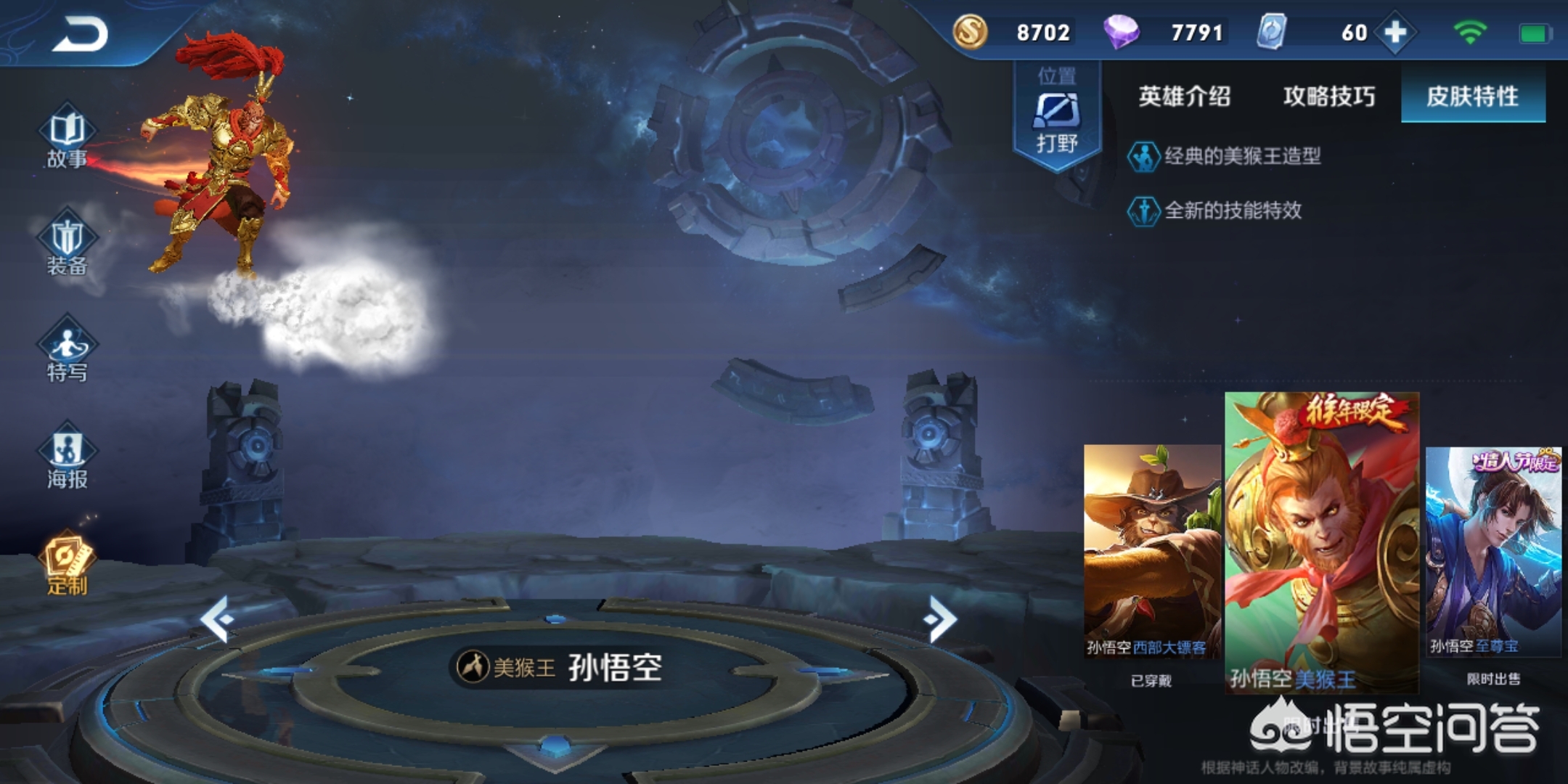 在孙悟空众多皮肤中,最经典的就是美猴王皮肤,虽然特效比不上其他皮肤,但是其最接近美猴王的形象,完美的体现了孙悟空的美猴王形象,这款皮肤返场呼声也比较高。