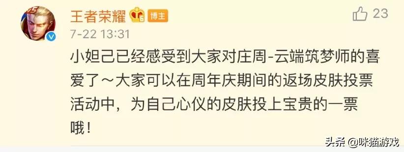这款皮肤官方一直说是要返场,但是迟迟没有见到身影。最后大家也都知道了,返场了雅典娜得神奇女王皮肤。这也引起一些玩家的不满。官方估计也是注意到了,宣布庄周云端筑梦师皮肤将会在周年限定皮肤返场活动中。