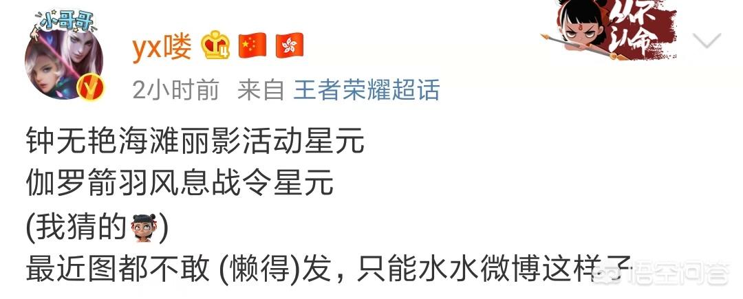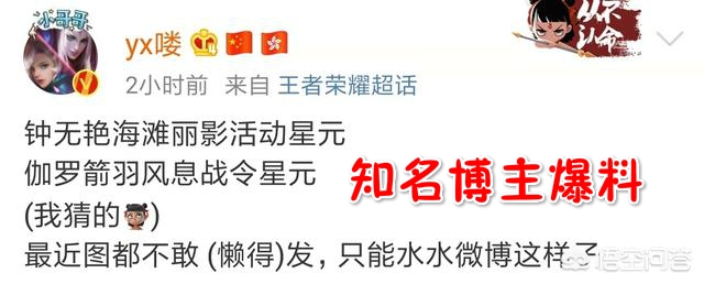 就在今天,某爆料大佬称,钟无艳的海滩丽影与伽罗的箭羽风息都会有星元皮肤,但是为了避免收到律师函,他称是自己猜的,并且说自己连图都不敢发,足以看出,现在这两款皮肤的星元皮肤已经有了原图,其实很多小伙伴都非常期待这两款皮肤的星元,特别是钟无艳,这款海滩丽影皮肤大多数玩家都已经获得了,而且局内效果也不错,算是为大家省了买皮肤的钱,也纷纷表示如果出了,肯定就会入手。