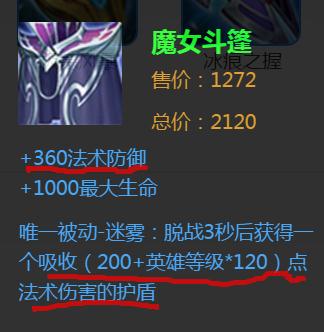 如果对面法师伤害高,一定要出魔女斗篷,+360法术防御,还有护盾抵免法术伤害。这是非常实用的装备,基本都出。
