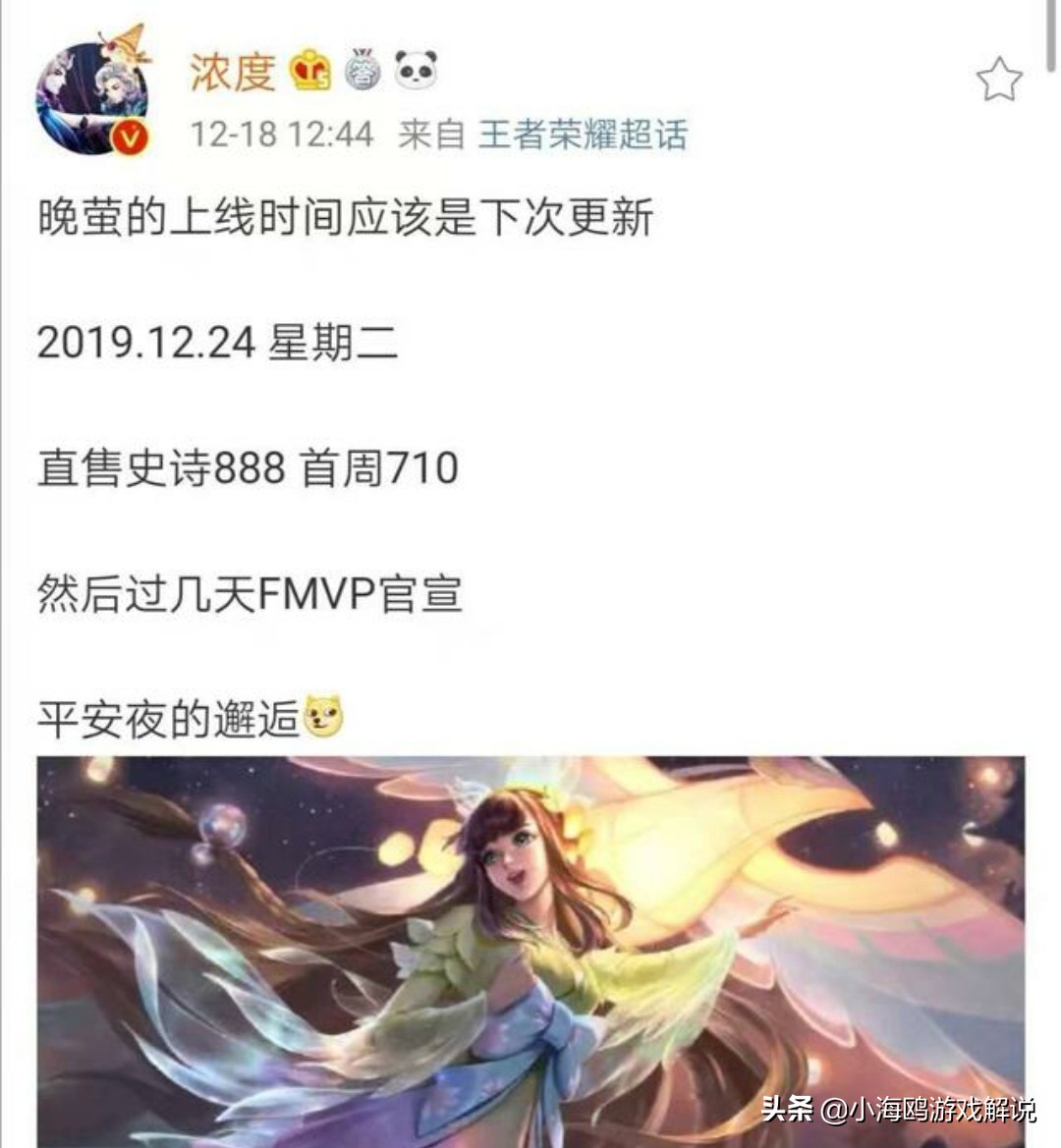 首先说的就是娜可露露新皮肤晚萤,自从被官宣后 一直收到很多玩家的关注,“晚萤”是首款snk英雄皮肤,所以该皮肤的品质为史诗级皮肤,而且在配音上还邀请了日本著名声优中原麻衣为她配音,可见王者官方对于第一款SNK皮肤的重视程度。而对于大家最关心的价格,官方也回应了大家,商城直售,888点券。不过按照惯例,首周折扣价是710点券。预计下周二就可以上线啦,是不是很期待呢。