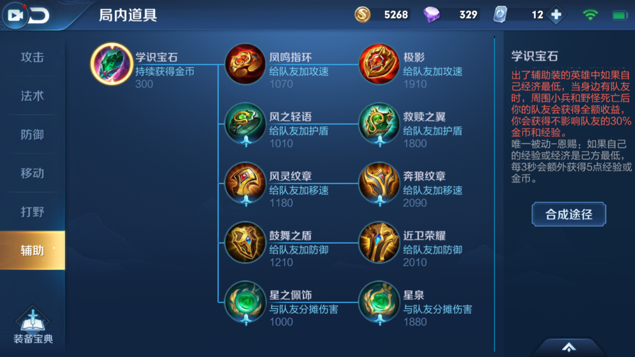综上所述,那么多好处为什么不帮中路?辅助宝石对于其他线路来说只有好处没有坏处,辅助反正也没办法吃线有个辅助宝石每3秒加五点经验5金币它不香吗?重点还加5%的移动速度,逃命也很舒服啊