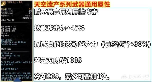泰波尔斯天空遗产武器属性如果不考虑稀释的话,提升率在1.45x1.3=1.885,是要超越圣耀的1.708的,而如果计算稀释的话,只要身上的装备除掉武器最终伤害小于68.5的话,也是天空遗产武器更强。