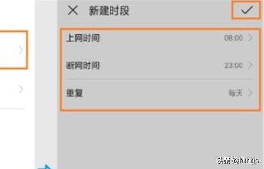 2、在添加设备列表中选择需要设置的设备,设置上网时间、断网时间及重复周期,点击右上角的“√”保存即可。设置完成后,儿童上网保护功能立即生效;