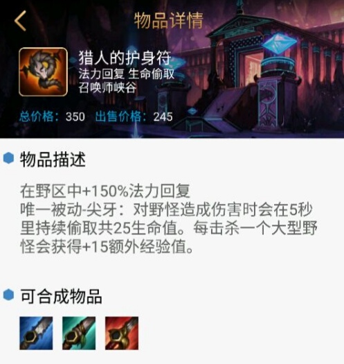 这样看来前期的皇子很难达到很高的AD,我个人皇子就喜欢带护穿,而猎人护符可以回蓝,让皇子有健康的蓝量进行gank或者在被反野的时候有技能可放,加上装备的被动意味这你从F5经过的时候丢个E技能就可以在后面5秒回复125生命值这对于前期皇子来说很重要。所以建议护符出门。