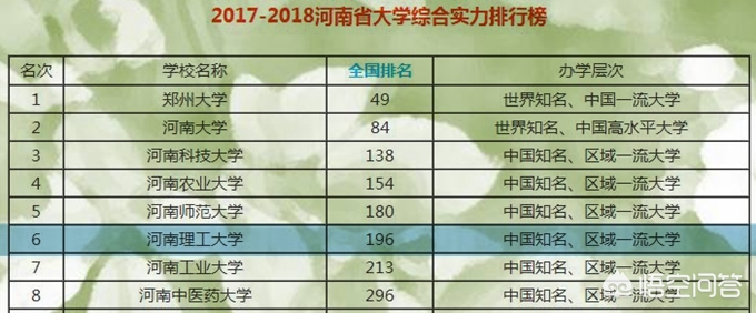 排名参考:在校友会中国大学排行榜中,河南理工大学位于全国第196位,河南省高校第6位,办学层次为中国知名,区域一流大学。