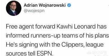 Haynes率先报道莱昂纳德将加盟快船。而后Woj和Shams才确定了这一消息,莱昂纳德团队告知其他追求者,他的计划是签约快船。随后Woj补充到莱昂纳德与快船签下的是4年1.42亿美元合同。