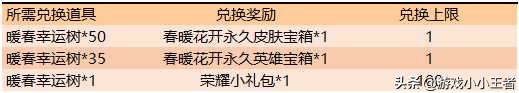 暖春幸运树兑换时间是3月31日-4月14日。玩家可以用不同数量的暖春幸运树兑换永久皮肤宝箱、永久英雄宝箱、荣耀小礼包。其中永久皮肤宝箱和永久英雄宝箱最多只能兑换一个。荣耀小礼包理论上是可以兑换100个,但是相信没有人会傻到去兑换这个吧。按照天美给出的暖春幸运树数量,玩家可以刚好兑换一个永久英雄宝箱和一个永久皮肤宝箱,还有一个荣耀小礼包。