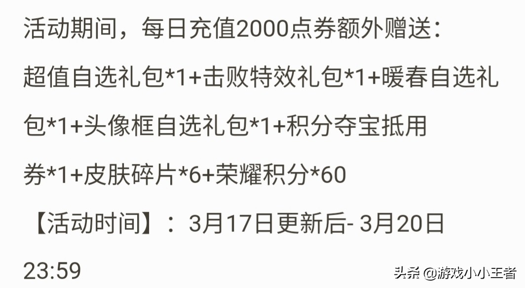 开启了每日充值送好礼活动,玩家每日充值满2000点券额外赠送超值自选礼包*1+击败特效礼包*1+暖春自选礼包*1+头像框自选礼包*1+积分夺宝抵用券*1+皮肤碎片*6+荣耀积分*6。