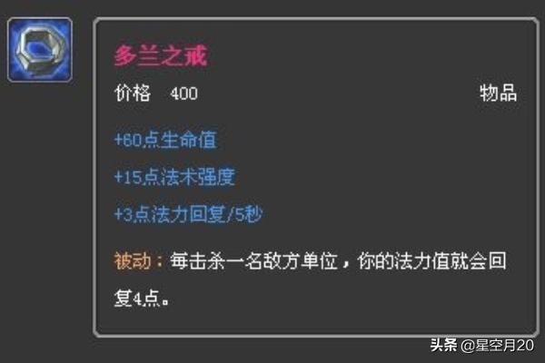 1、出门装。小鱼儿出门装没什么好说的,前期尽量以补刀为主,然后利用技能消耗对方,所以多兰戒指+血瓶出门就很不错。