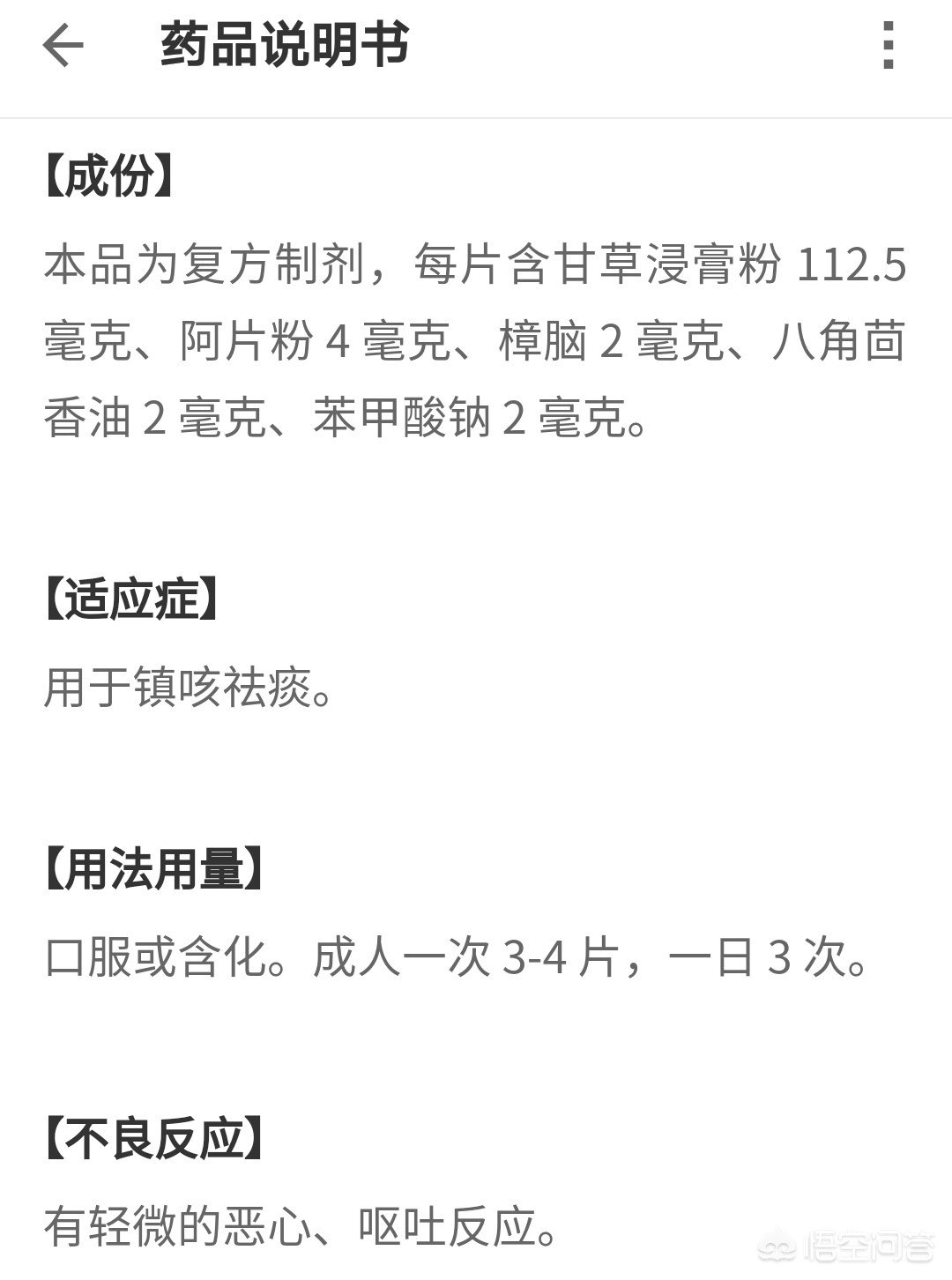 首先,纠正大家一个错误认知,复方甘草片不是中成药,它属于合成药物,复方制剂,为便于大家更好的人是复方甘草片,我特意给大家找了一张复方甘草片的药品说明书(如下图)