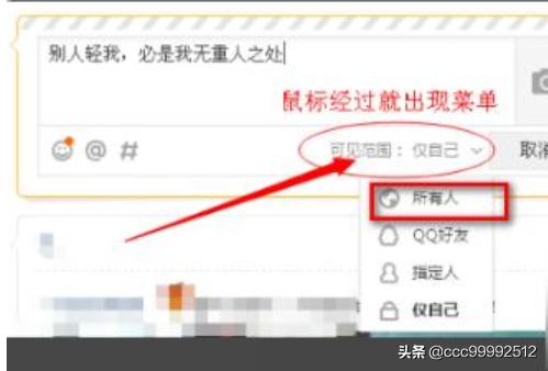 5、然后,将鼠标移到”可见范围“中取消”仅自己可见“,选择”所有人“然后发表,之后在手机QQ发表说说即可所有人可见。