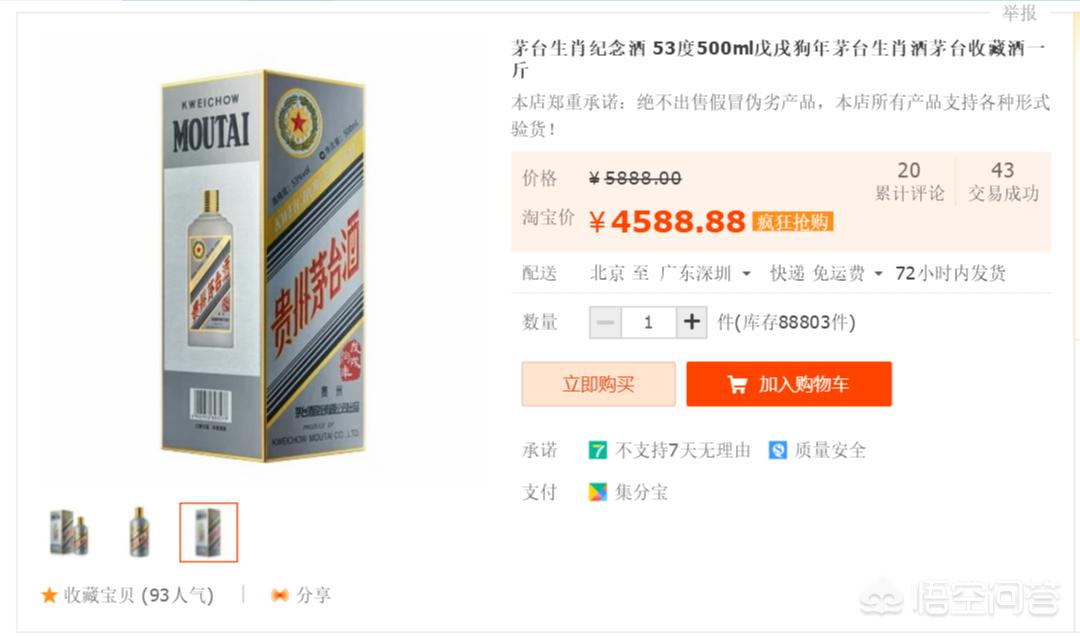 限量发行的300万瓶狗年生肖茅台酒,经销商分掉的部分满足各自老客户需求都不够,一般资深的老客户和高级会员才能限量买一两瓶,所以普通消费者在专卖店里根本看不到狗茅的身影;