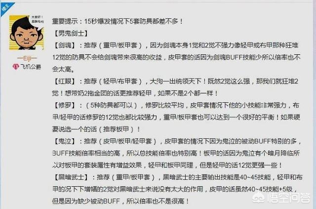 首先是剑魂,剑魂Eiji给出来的防具推荐是重甲和板甲套。原因是剑魂的技能伤害分配比较均衡,个人觉得是有一定的道理的;但是剑魂的一觉其实伤害是非常强势的,轻甲的四级一觉加成加上35%的属白应该也是非常强势的,所以个人认为除了重甲和板甲,轻甲一样适合剑魂。