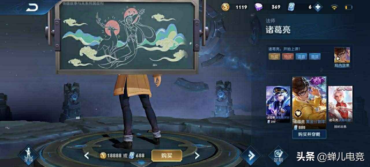 诸葛亮是一个非常强势的法师,这个英雄操作性非常的高,伤害当然也非常的爆炸。在诸葛亮的皮肤中销量最高热的最大的就是黄金分割率,这款皮肤品质是史诗级别售价是888点券,在神秘商店购买,只要444点券,可以优惠一半的价格。而且这款皮肤还有多套星元套装,可以说是非常值得购买,每次峡谷有什么小爆料都是从诸葛亮的小黑板上出来的。