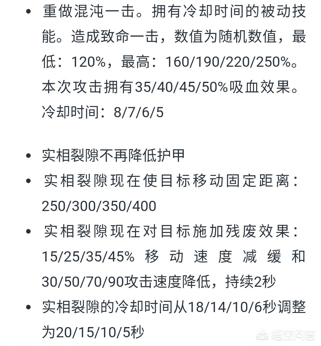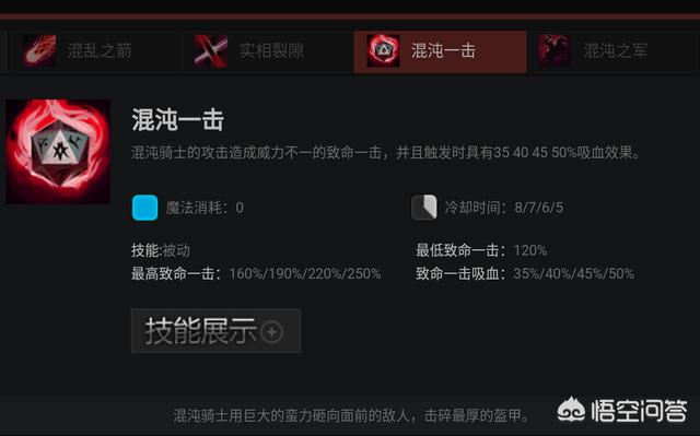 首先混沌的三技能混沌一击重新改动,新技能变为一个拥有CD的被动技能,冷却时间为8/7/6/5秒,致命一击的最低伤害为120%,最高为160%/190%/220%/250%,并且拥有35%/40%/45%50%的吸血。这个技能相比较原技能增加了CD时间,但是也拥有了吸血效果,整体上比之前更加稳定,而不是一个纯粹看人品的被动。