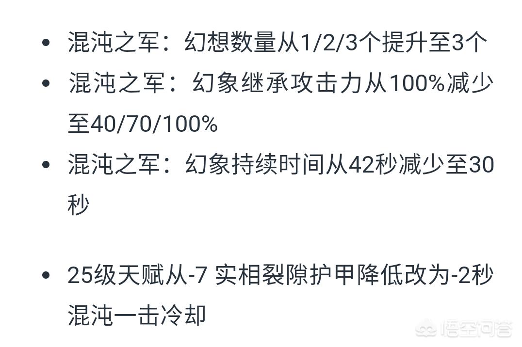 混沌的大招幻想这次也有了比较大变化,幻想数量从过去的1/2/3变为统一的三个,不过继承的攻击力由过去的100%调整为40%/70%/100%,幻想持续时间也从42秒减少为30秒。天赋上将实相裂隙减7点护甲改为减少2秒混沌一击冷却CD。