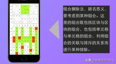 5、组合摒除法,顾名思义,要考虑到某种组合。这里的组合既包括区块与区块的组合,也包括单元格与单元格的组合,利用组合的关联与排斥的关系而进行某种排除。