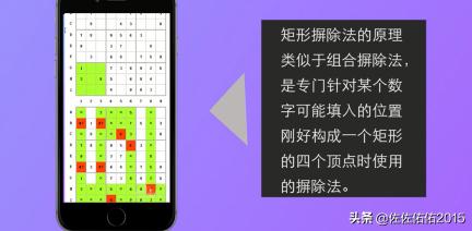 6、矩形摒除法的原理类似于组合摒除法,是专门针对某个数字可能填入的位置刚好构成一个矩形的四个顶点时使用的摒除法。