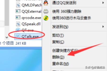 7、进入本地路径,找到QTalk.exe程序,右键点击选择删除,任务完成,以后每次关闭穿越火线游戏圈图标不会再弹出。