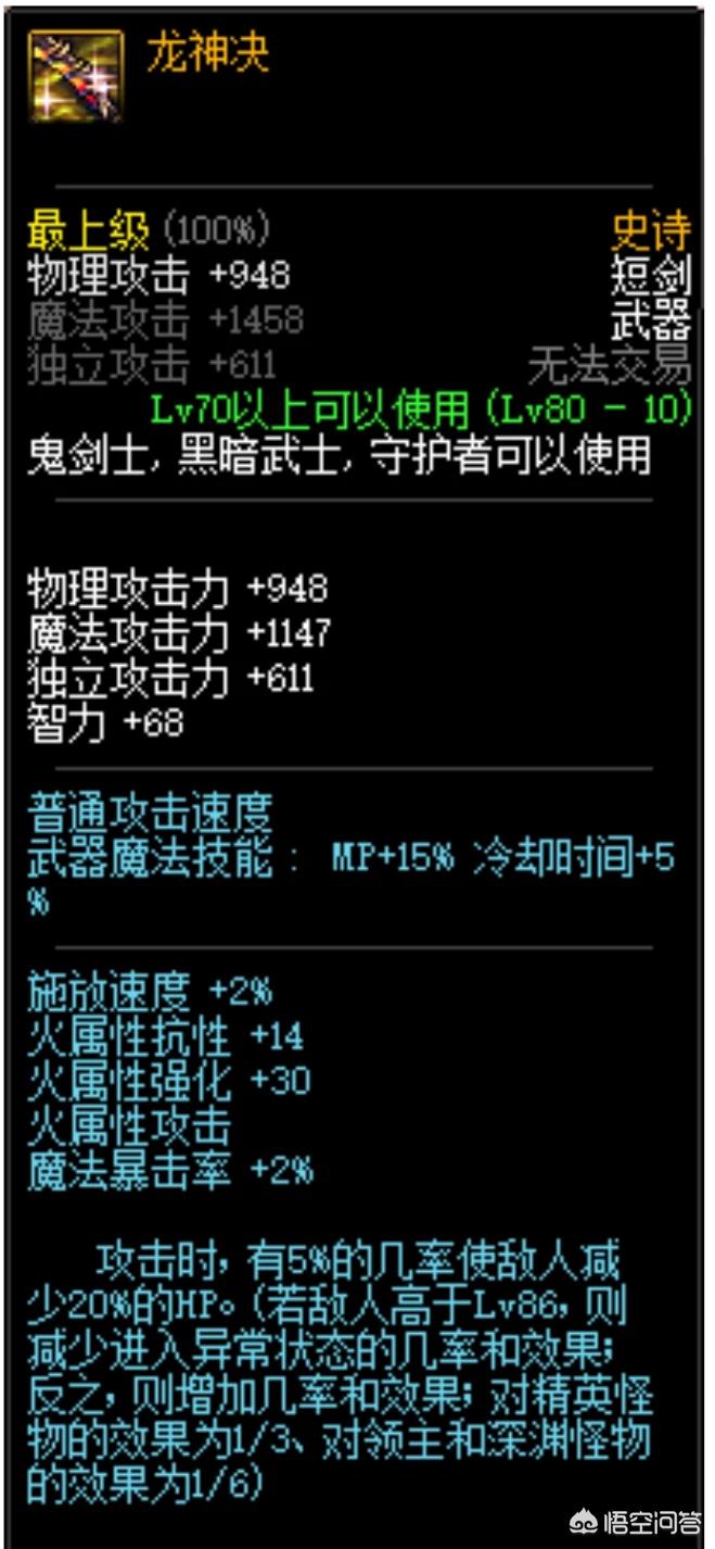 龙神决是一把80史诗短剑,有5%几率减少敌人20%HP