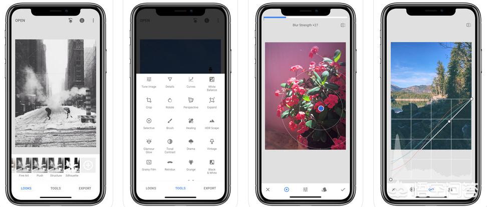 goole开发的一款专业的修图软件,没有任何广告,29种滤镜和工具,包括修复、画笔、HDR和透视等功能,可以打开RAW文件,网上也有超多的教程,用手机就能调出大片,堪称手机中的ps,很多摄影爱好者都用这个。