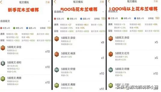首先,咱们开始说铭文,新手推荐铭文:10调和、10鹰眼、10异变; 500场木兰铭文推荐:10狩猎、10鹰眼、1祸源9异变; 1000场以上木兰推荐铭文:10狩猎、10鹰眼、5红月5异变。 大家应该发现了,随着场次的增加小编推荐的铭文所加的攻速越来越多,暴击率也是慢慢增加,物理穿透却慢慢减少。其实,木兰打沉默,在高端局,真的需要一些攻速才能更好的打出沉默,大家玩久了,会慢慢懂的,这里就不多说了。