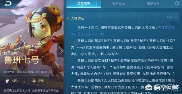 再来看看鲁班七号的人物传记,这不妨说是鲁班大师的人物传记,让我们默哀鲁班七号三分钟,连人物传记的主角都被鲁班大师拿走了,这里面暴露了鲁班大师的性别是男的,而且应该很丑很自恋,为什么这么说?我们来看看第二段和第三段的描述,鲁班大师的年龄是秘密,身高是秘密,真实面目也是秘密,一般来说只有丑人才会把相貌遮掩起来,并且很自恋的认为自己是潇洒的,而括号里面也暴露了鲁班大师的一个缺点,发际线很低。