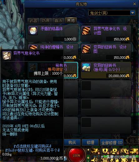 虽然玩家在克伦特中一周可以用600W购买两本异界气息净化书,但是对于大部分玩家来说其实根本就不够用,也许只玩一个号在更换装备的时候可以解决,但是对于多号党来说,克伦特一周两本的异界气息净化书实在太少了,面对装备继承,刻印需要解除红字,只能在拍卖购买净化书才能解决,同时策划也借此商机,将净化书的价格抄上去。
