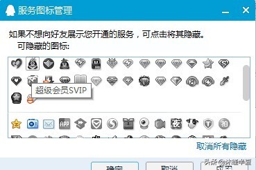 4、如果不想向好友展示你开通的服务,可点击将其隐藏。下面可以隐藏的图标,都是充钱类别的图标,显富必备,怕盗号慎用。