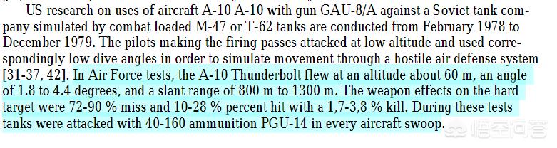 从实弹射击的效果来说,A10面对的坦克类目标,基本都可以达到这个要求,既便新一代坦克也很难保证安全,更不要说,它还有其他的武器,绝对不仅仅是机炮的问题,还有反坦克导弹等等,空中打击威力是非常强的,绝对不可以小看它的能力。