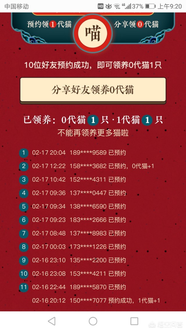 活动期间用户成功提交预约,即可领养1代猫1只;邀请并获得10位好友的帮助,可以领养十分珍贵的0代猫1只~