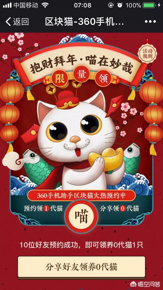 360区块猫预约活动时间是2月14号至2月21号,这个活动预约1代猫是很轻松的,在活动时间内登入预约网站即可,关键的是0代猫,因为它是限量5万只的,而且0代猫是要在已经预约了1带猫的基础上完成邀请10个好友的任务才能领到的,而且官方限定了邀请方式,只能通过微信邀请,这就比网易那个星球的邀请方式难多了,所以说要领到0代猫目前只有这种方式。你可以老老实实在自己微信里找10个好友请他们帮忙(我就是这样的),也可以在微信上找人帮忙代刷,我一开始没邀请完人时有人介绍给了我,大概1.5元一个人,你要的话可以私信我,我发给你他微信号。