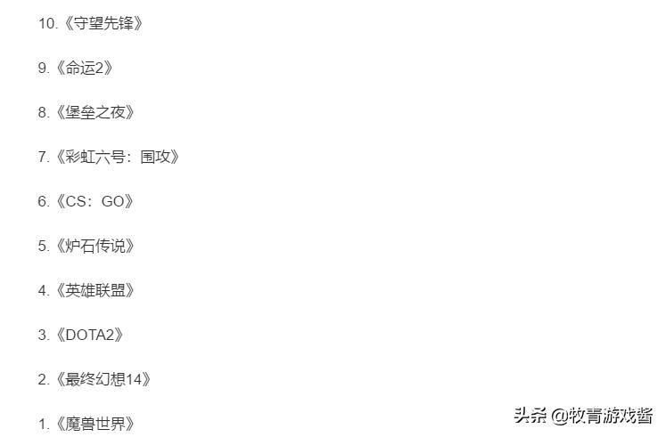 首先我们从截图中可以看到,十大网游的顺序排列。其中第一名为魔兽世界,这款游戏自从发行之日起,就深受广大玩家的喜爱,至今已有十多年的时间了。而且在前段时间,魔兽世界的怀旧服已经公测,前去体验的玩家更是数不胜数,可见魔兽世界的地位简直是无可动摇的,位列第一也是实至名归。在排行榜中,还有几款MOBA类游戏,比如LOL、DOTA2等。对于FPS类型的游戏,大家也是非常喜欢,榜上也出现了很多。