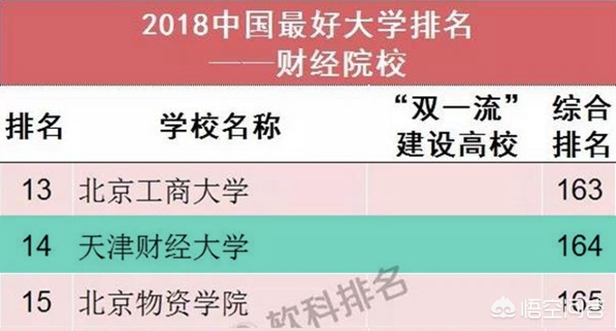 在上海软科2018中国最好大学财经院校排名中,天津财经大学位居全国第14位,全国总排名第164名。