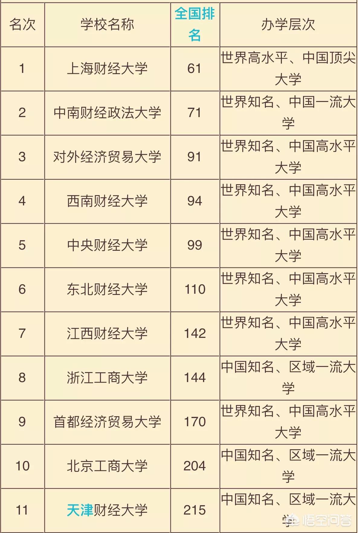 在校友会中国财经类大学排行榜中,天津财经大学排在全国第215位,财经类院校第11位,办学层次为中国知名,区域一流大学。