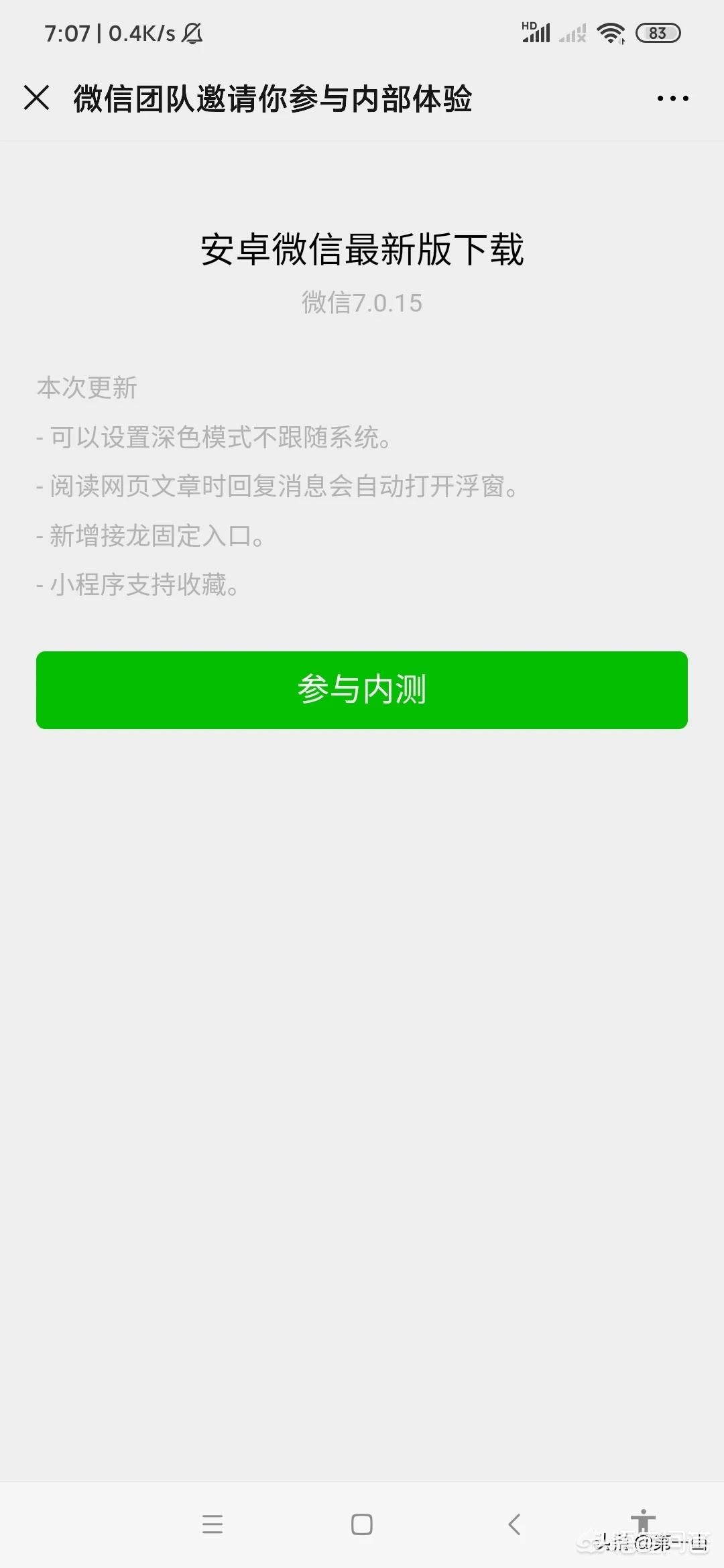 5月20日下午16:34,腾讯微信发布最新的安卓内测版7.0.15更新邀请,开发者可以通过内测。