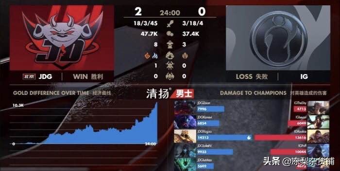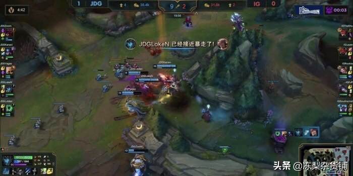 但是很遗憾,小乐言没有站出来,之后的小龙团,IG占据地势优势拿下小龙,豹女毕竟领先Kanavi两级,拿下小龙后IG追击,JDG绿毛天秀发挥逆转,勾住小乐言立即反打,JDG秒掉小乐言豹女后开始追击,击杀theshy后去拿大龙,拿下大龙的JDG不给机会,中路逼团,然后下路推塔,22分钟JDG推掉下路高地后,IG尝试反打,本来Zoom都打算卖自己的,但是锤石的灯笼硬是救活了他,IG气不过开始追击,绿毛实力上演“一人断后一护四”,由于IG追得过急过深被找到机会,又是锤石,击杀IG两人后成功一波结束比赛。