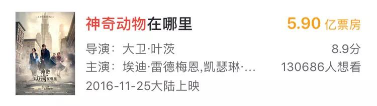 再说回票房号召力,影片本身已经有强大的原著、电影粉丝群,受众已经很庞大了,很难想象不了解哈利波特魔法世界的人会贸然去看该系列影片,所以本系列影片的号召力或许根本就不在片名上,而在于前作世界观的架构上,收获5.9亿票房已经是很不错的成绩了。