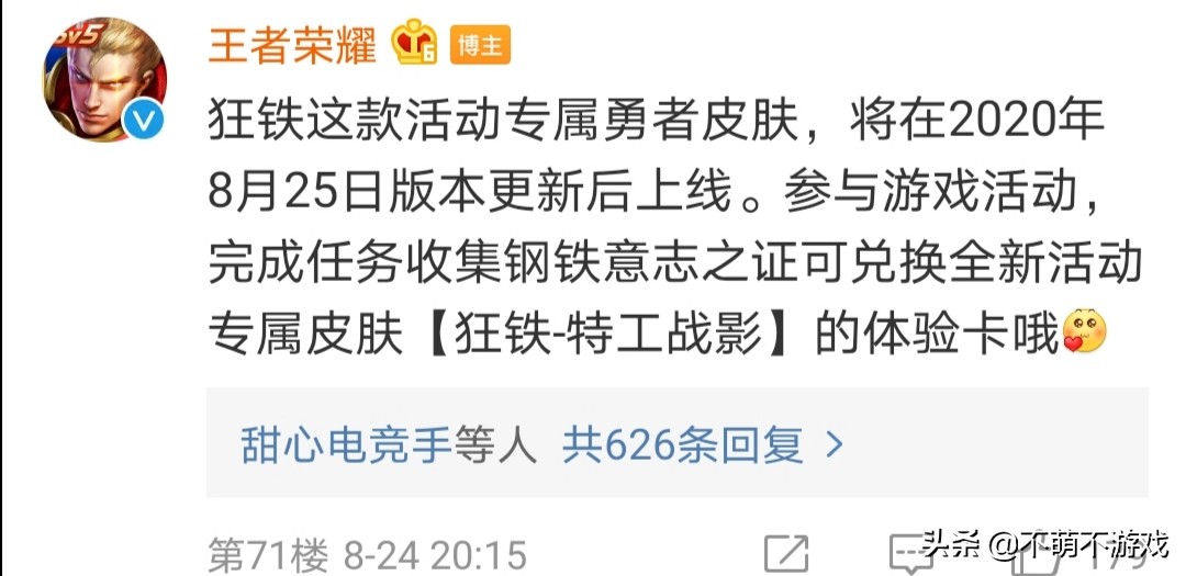 说实话,这款皮肤的色彩确实比较另类,一个铁骨铮铮的汉子,居然用上了紫色的皮肤,而且大家仔细看一看官方的介绍,明天上线后,居然不是直售,而是通过活动来获取体验卡,我在想,以现有的狂铁热度,这款皮肤就算直售恐怕都不会有太多人入手,这次采取体验卡的形式发放给大家,估计也不会有太多人去参与,个人倒是希望能够永久获得,小伙伴们,你们认为呢?
