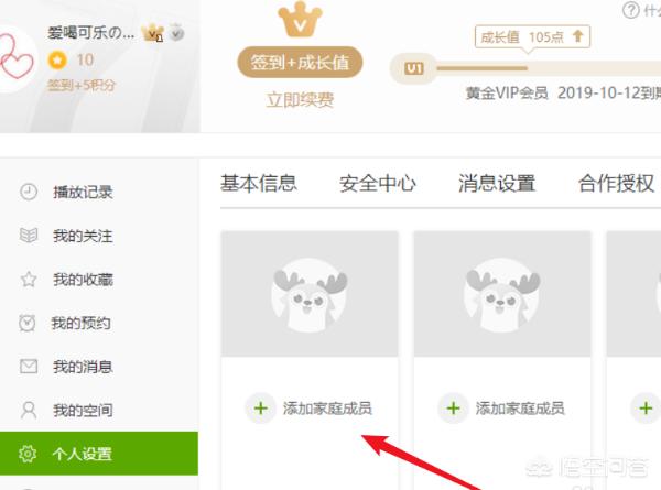 3、在会员信息页面,点击“添加家庭成员”按钮。