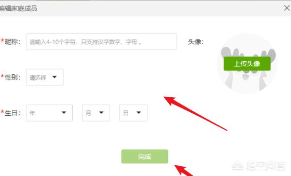 5、按照提示依次输入家庭成员的昵称、性别、生日、头像。编辑完成后点击“完成”按钮。
