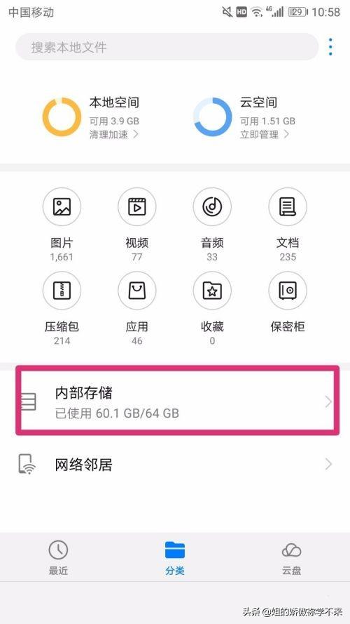 3、进入“文件管理”后,点击“内部存储”进入。