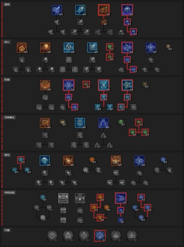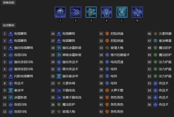 这是所有职业中最好用的升级BD之一,主要思路是结合【连锁闪电】的AOE+【电弧鞭笞】的高伤来快速清怪。主要防御技能是【冰霜新星】、【寒冰甲】和【传送术】,【强化寒冰甲】也能带来法力回复速度的加成。