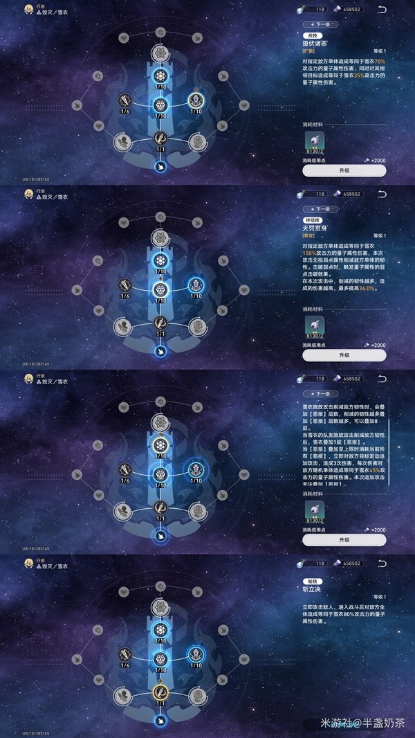 雪衣的秘技就是立即攻击敌人,进入战斗后对全体敌人造成少量伤害。朴实无华,不必过多赘述。