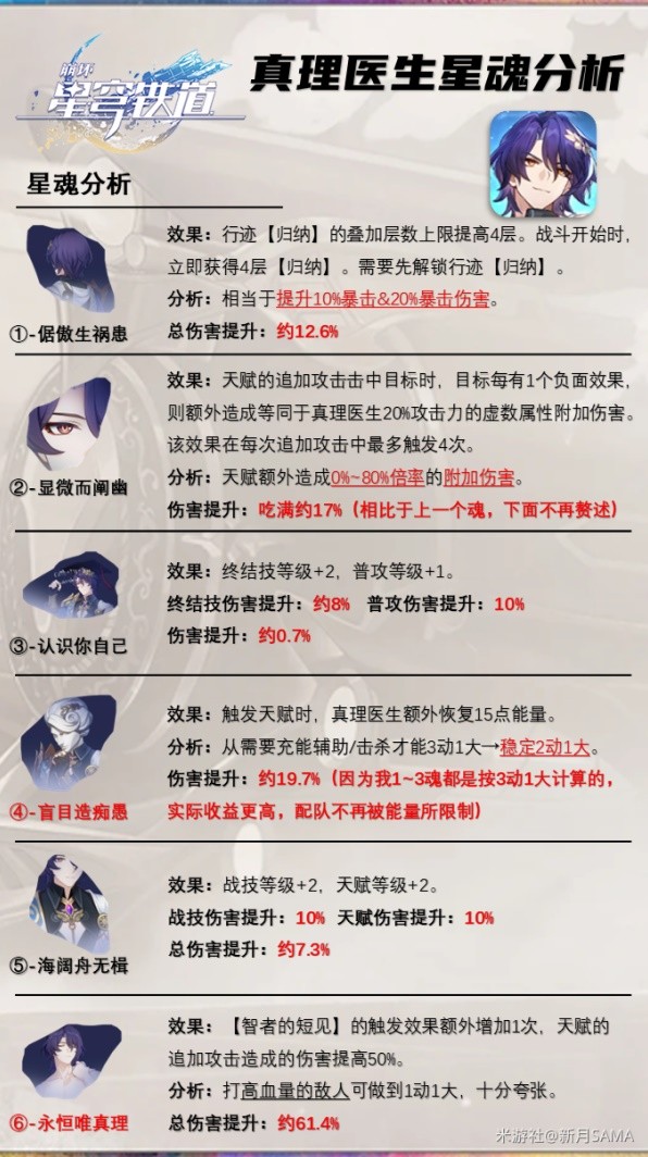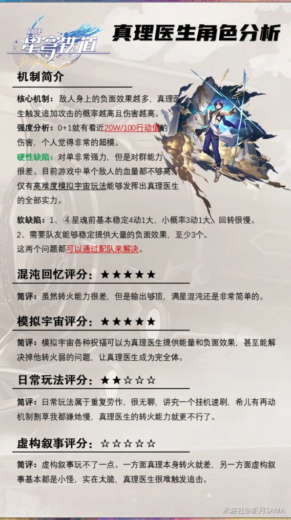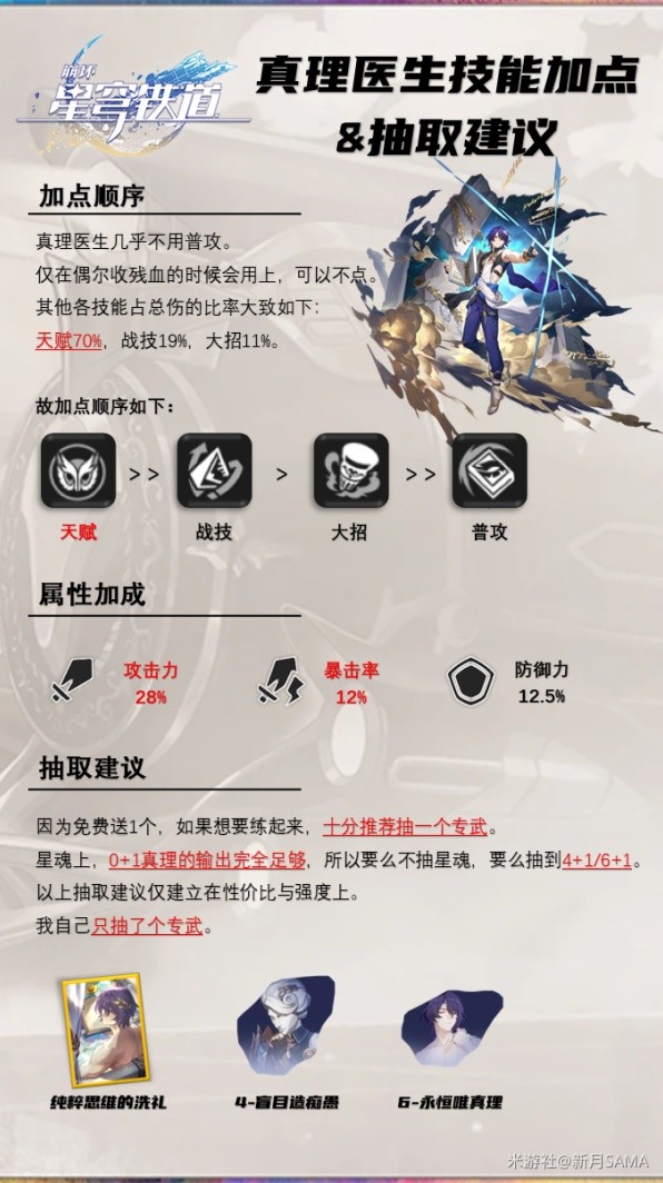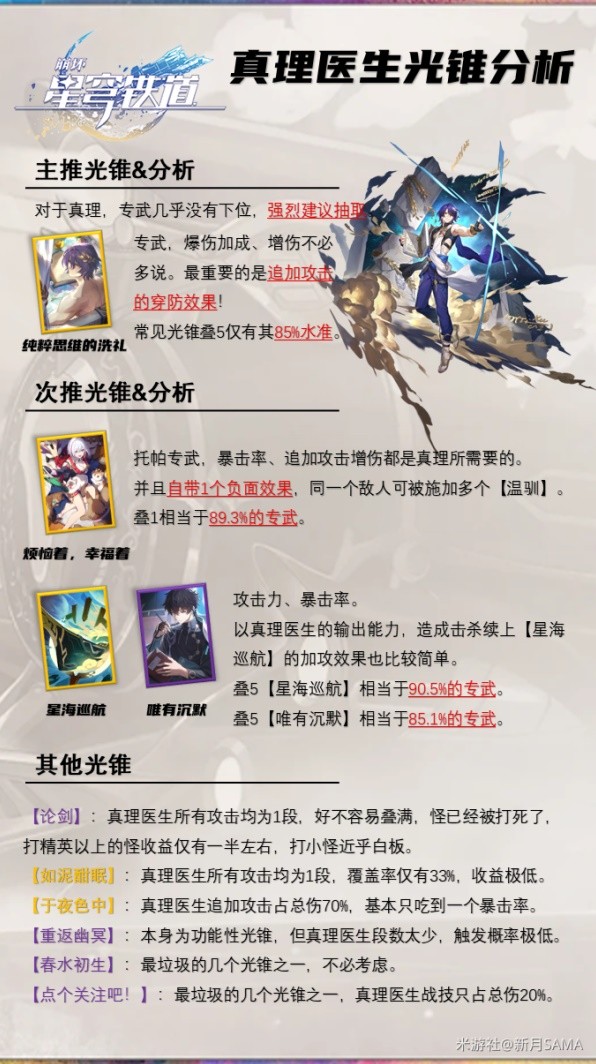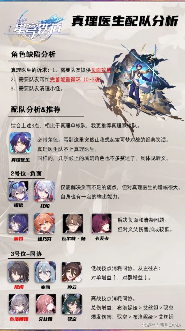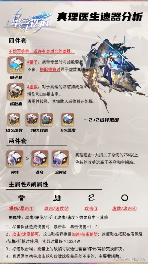 《崩坏星穹铁道》中真理医生对单输出很高,但是部分玩家不知道该怎么给他搭配装备,下面请看“新月SAMA”带来的《崩坏星穹铁道》真理医生详细配装指南,希望能够帮助大家。