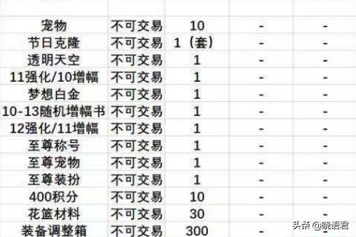 那么我们把上面的东西全部都卖掉了,还剩下什么呢?根据这位大佬的清单,还剩下10个宠物(礼包内提升最大的部分),1件透明天空,一个11强化或者10增幅,一个梦想白金,一个10~13随机增幅,一个12强化或11增幅,至尊称号、装扮、宠物,4000积分,30个花篮材料和300个装备调整箱——