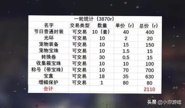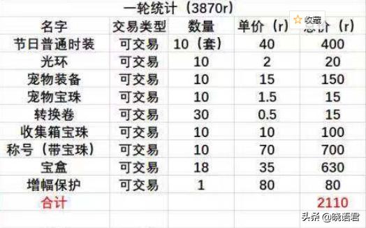 先来看看目前最主流的“极限回本”算法,买10套,将所有的可交易道具全部出售,包括增幅保护书,按照1:60的比例计算,时装2400万,光环120万,宠物装备900万,宝物礼盒2000万,带宝珠的称号4200万,这样的定价相对来说,不是很离谱。全部卖掉,大约可以回血2110元。